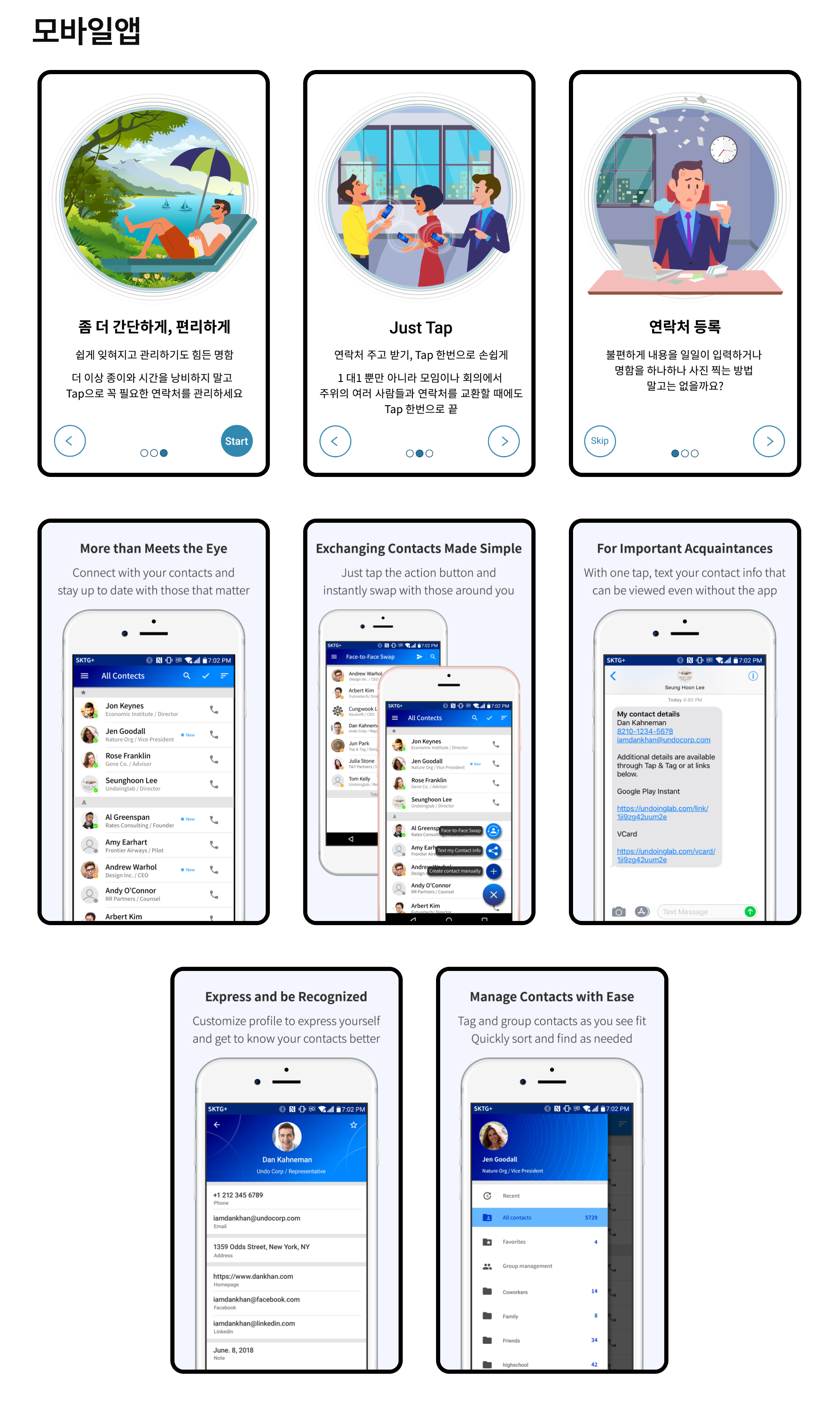 Undoging Lab 의뢰로 스마트한 디지털 명함앱을 제작하였습니다. 한번의 탭으로 디지털 명함을 서로 교환할 수 있습니다. 명함 정보가 수정되면 교환한 사람끼리는 업데이트된 정보를 바로 알 수 있고 간단한 메시지 교환도 가능합니다.